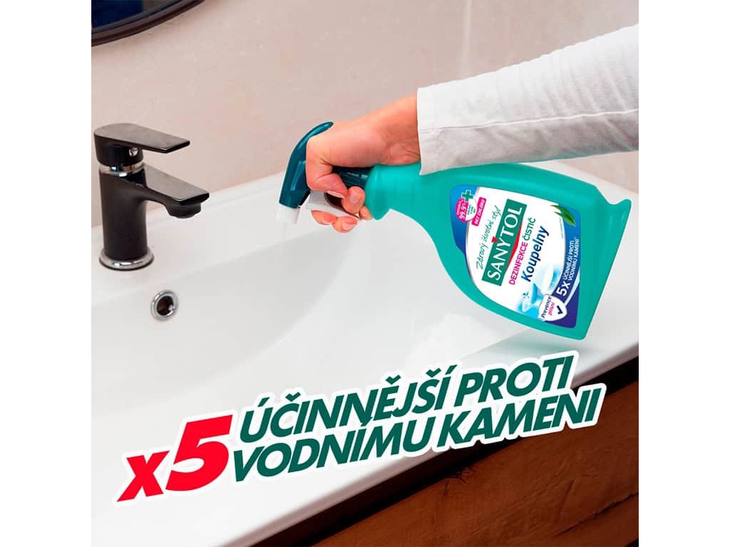Sanytol dezinfekční čistič na koupelny a vodní kámen je ideálním pomocníkem pro hygienickou čistotu vaší koupelny. Účinně odstraňuje vodní kámen, mýdlové usazeniny a nečistoty, zatímco eliminuje až 99,9 % bakterií, plísní a virů.