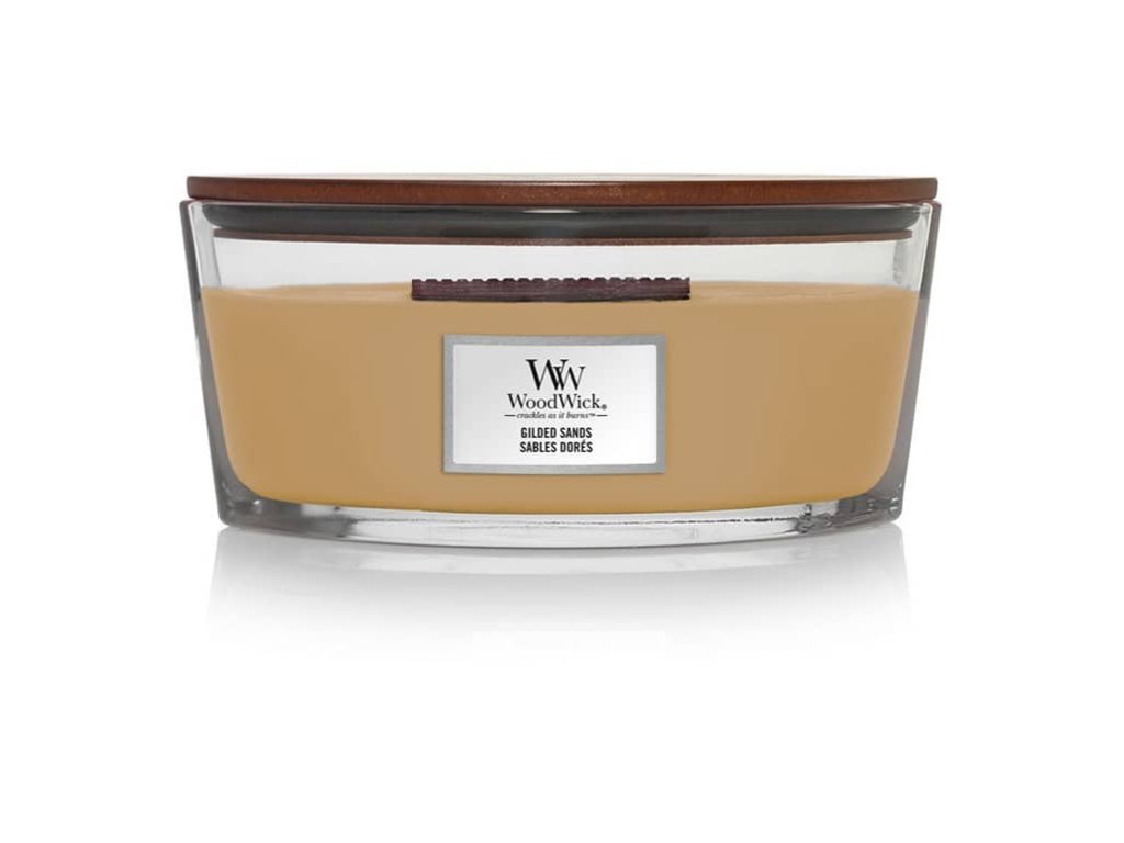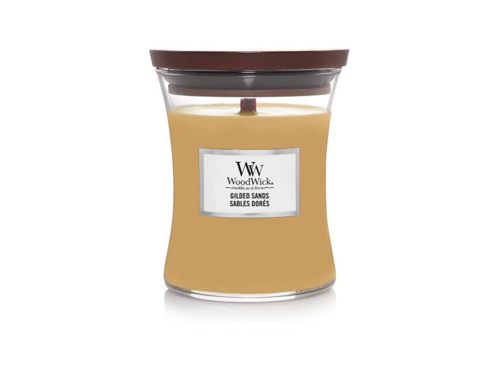 Svíčka WoodWick Gilded Sands vyzařuje atmosféru skrytých pouštních pokladů a hřejivé elegance. Nejprve pocítíte vrchní tóny bergamotu, fíku a pepře, střední složka rozvíjí vzduch pouště, vetiver a jasmín, a základní tóny přinášejí guajakové dřevo, jantarové písky a elemi.