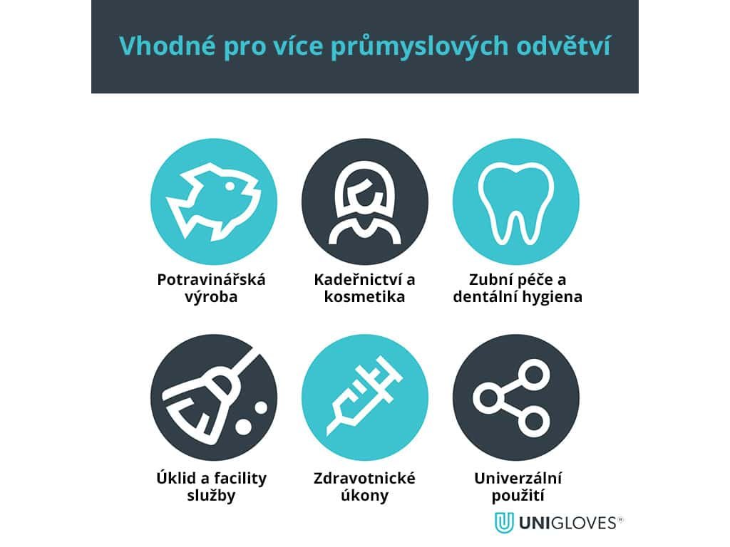 | Provedení | syntetický nitril, obouruké, bez latexu a latexového proteinu, bez pudru, rolovaný okraj, nesterilní, hypoalergenní, mikrozdrsněné konečky prstů, schváleno pro styk a práci s potravinami |
