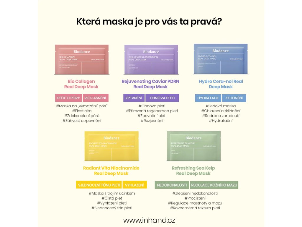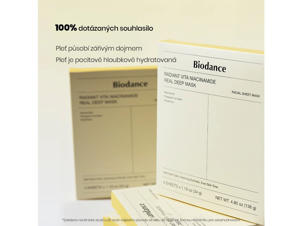 Navraťte své pleti ztracený jas a vitalitu, protože BIODANCE Radiant Vita Niacinamide Real Deep Mask kombinuje sílu rozjasňujících vitamínů s hloubkovou hydrogelovou technologií, která promění unavenou a nejednotnou pleť v zářivou a vyhlazenou. Tato maska obsahuje vyvážený mix niacinamidu a vitamínů, které cíleně redukují viditelnost pórů a tmavých skvrn, zatímco hydrogelová struktura reaguje na teplotu vaší pokožky. Během 3 až 5 hodin (nebo v průběhu spánku) maska zcela zprůhlední, což signalizuje, že všechny rozjasňující a hydratační složky pronikly hluboko do epidermis. Výsledkem je dokonale sjednocená, svěží a odpočatá pleť s přirozeným „glow“ efektem.