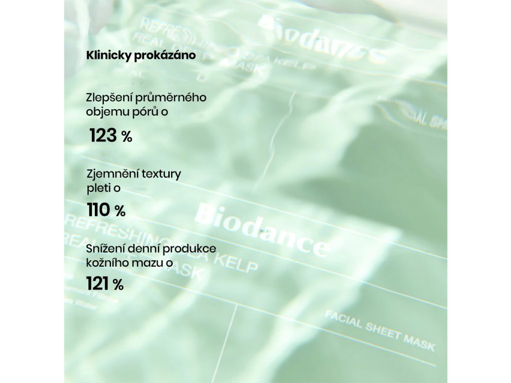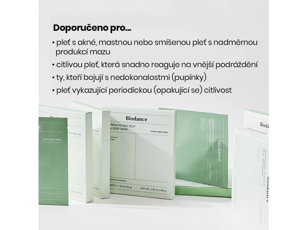 Dopřejte své pleti osvěžující koupel z mořských hlubin, protože BIODANCE Refreshing Sea Kelp Real Deep Mask využívá sílu extraktu z mořských řas (Kelp) k tomu, aby unavenou a oteklou pleť proměnila v oživenou a zpevněnou. Tato hydrogelová maska reaguje na teplotu vaší pleti a během 3 až 5 hodin (nebo v průběhu spánku) zprůhlední, čímž potvrdí hloubkovou absorpci všech aktivních látek. Složení je bohaté na minerály a antioxidanty, které pomáhají čistit póry, vyrovnávat texturu pokožky a poskytovat intenzivní zklidnění po slunění nebo náročném dni. Výsledkem je vysoce hydratovaná pleť s přirozeným jasem a pocitem lehkosti.