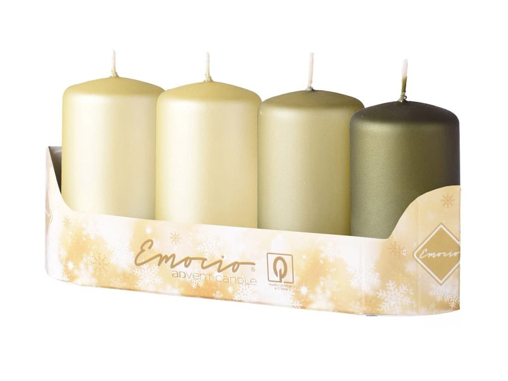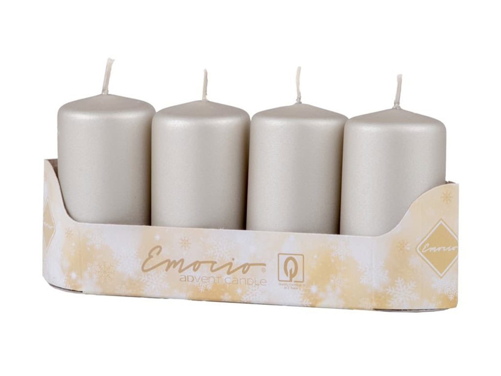 Tato sada 4 válcových svíček Emocio v rozměru 40 × 75 mm se vyznačuje metalickým matným povrchem, který dodává jemný dekorativní nádech. Tvary válců a výška 75 mm dělá z těchto svíček univerzální volbu pro adventní věnce, dekorativní aranžmá nebo jako doplněk interiéru.