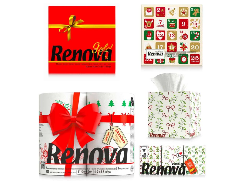 V krásné červené dárkové tašce se ukrývá sada originálních papírových produktů Renova s vánočními motivy – od toaletního papíru až po kapesníky a ubrousky.