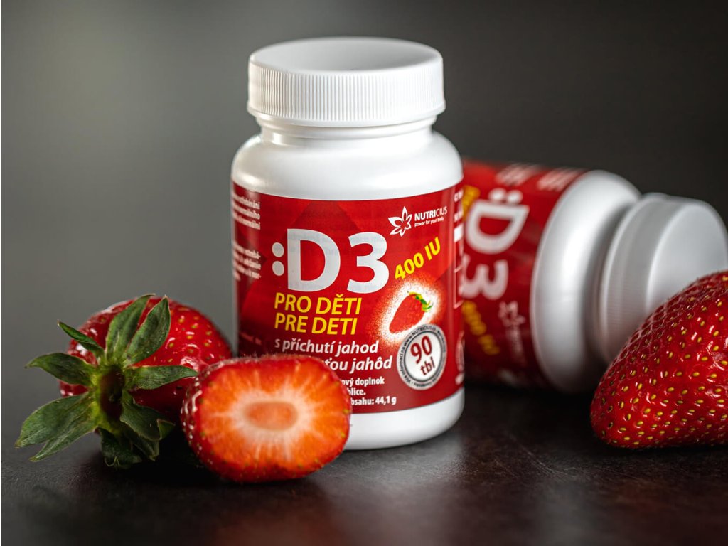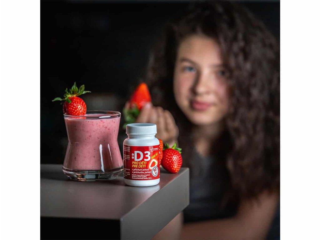 Vitamin D3 (cholekalciferol) je nezbytný pro normální vstřebávání a využití vápníku a fosforu, které jsou klíčové pro udržení zdravých kostí a zubů. Tento vitamín také přispívá k normální činnosti svalů, funkci imunitního systému a procesu dělení buněk, což je obzvlášť důležité v období dětského růstu. Tablety se volně rozpouštějí v ústech a mají příchuť jahody, aby bylo užívání pro děti co nejpříjemnější.