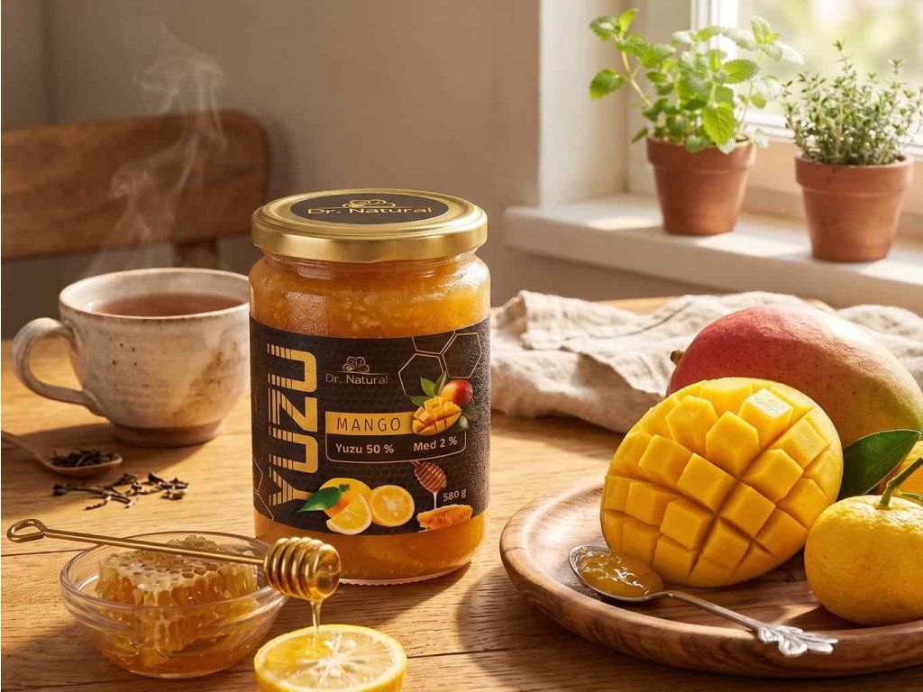 ento ovocný koncentrát kombinuje osvěžující kyselost citrusu yuzu s medovou sladkostí manga. Plody yuzu jsou zpracovávány celistvě, aby v nápoji zůstaly zachovány kousky kůry bohaté na esenciální oleje. Mango dodává směsi sametovou texturu a exotické aroma, které skvěle doplňuje jemný včelí med. Je to ideální alternativa k běžným čajům a sirupům, navíc zcela bez umělých barviv.